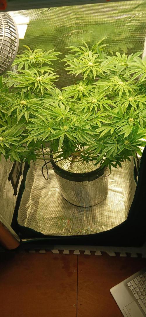 Went on vacation so I left her for 16days unattended. I was expecting her to be dry but because it hydroponic the reservoir was still surprisingly full. She did grow to touch the lights however i caught her in time. I transfered her to a 2x2 tent. Tomorrow I will give her a trim, training and fresh reservoir clean out.