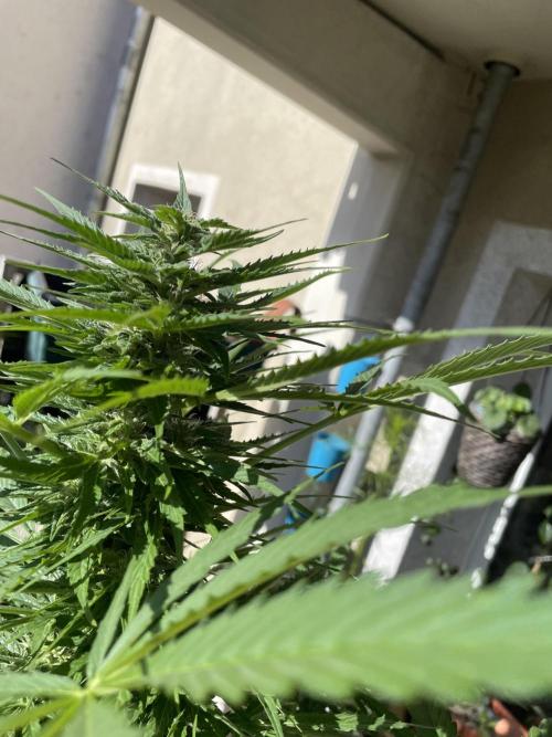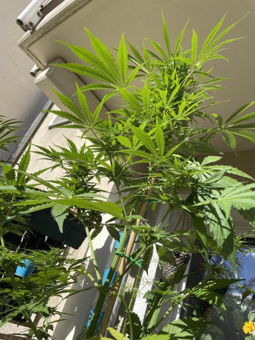 Miketama Northern Lights #2 has successfully entered flowering stage this week, showing early flowering sites development. Environmental Transition: Northern Lights #2 was gradually moved to balcony location and exposed to natural sunlight. Plant has successfully acclimated to outdoor conditions without stress or adverse effects. Substrate Management: • Cotyledons (seed leaves) dropped naturally, indicating healthy plant maturation • Added fresh substrate to pot level, reaching first node for enhanced root development • Applied light-colored gravel mulch as soil cover for moisture retention and temperature control Plant Training: Continued Low Stress Training (LST) protocol throughout the week. Fertilization Program: • Foliar spray application of BioBizz Alg-A-Mic for enhanced plant vigor and flowering support • Root feeding with RQS BiggerFlower (once in a week)