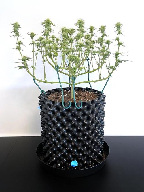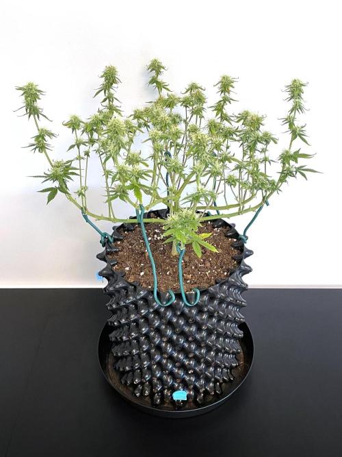 drakkon The Watermelon Automatic is growing fast and has not yet started to flower. There are pre-flowers at many branch sites, but the growing tips still appear like vegetative growth. I did introduce some dilute bloom nutrients to her watering regimen, as I expect she'll start flowering soon. Training and light defoliation continue. She's starting to have quite a lot of secondary branches and potential bud sites, which looks promising.