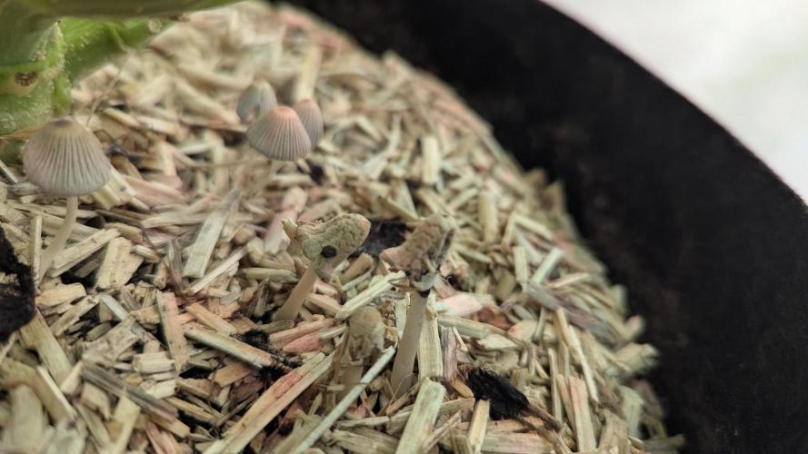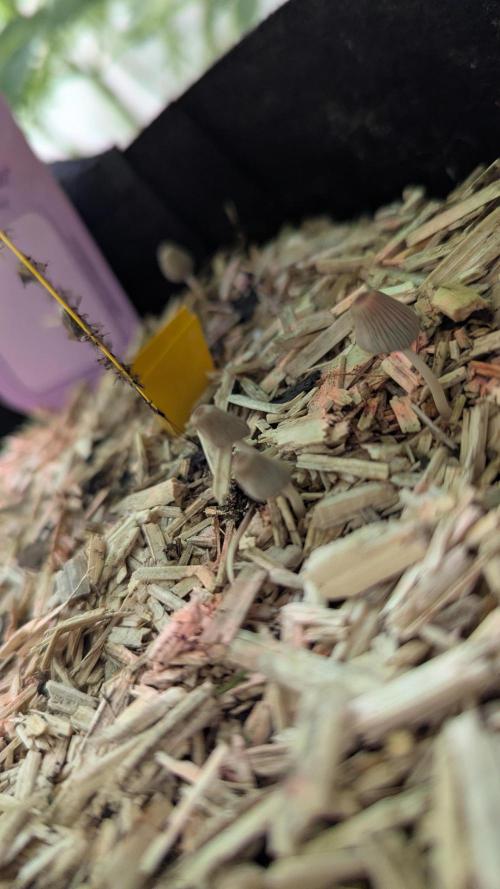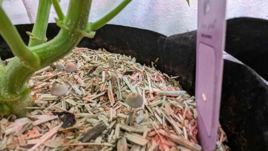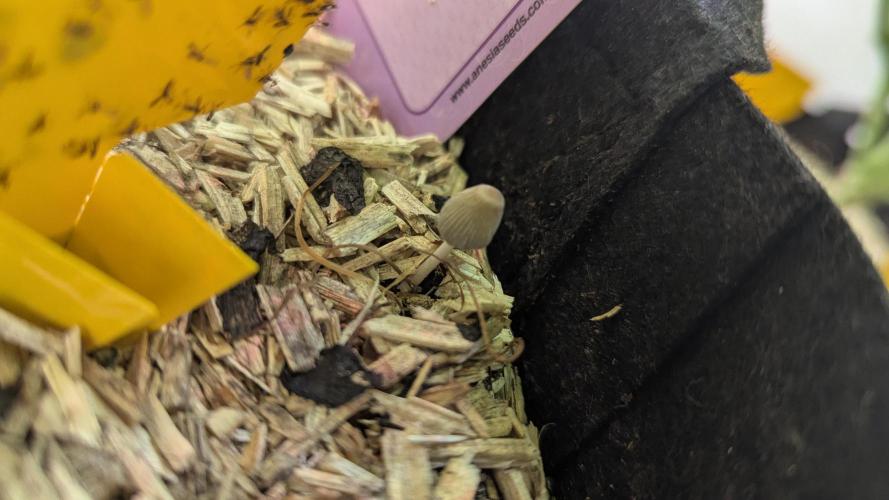 Her canopy finally thins out a bit, thanks to her growing up. Her shape resembling a bushy leaf ball was a bit concerning as it didn't allow much airflow. It's definitely better now, and I'll do some defoliation sometime this week. The lollipopping I did during last week helped a lot, and she seems to respond pretty well. There are regular mushroom friends visiting her now, and usually quite a fungi bunch.
