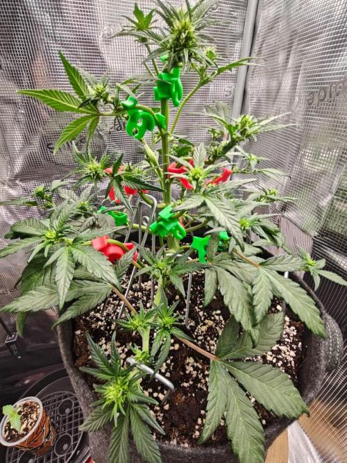 I've decided to LST the top of the main branch now as I was able to perfectly put an LST clip on the top between the nodes now, hopefully this will slow it down a bit, because the side branches are NOT catching up with it yet at all. Also been adjusting the LST'ing on all the side branches, a lot of new flowering nodes are starting to bulk up now because of it, just gotta keep tucking the fan leaves to allow for all the nodes to get their direct light.