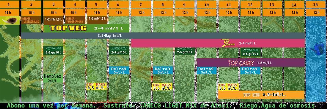 cuelgo una tabla de abonos que sigo bastante, algunas veces no cuadran las datas al 100% y se hace de mas o de menos y uno siempre pendiente por si hay una sobrefertilización, en el caso que la hubiera dejo de abonar un par de riegos y rebajo la dosis.