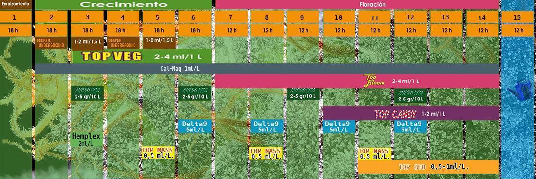 cuelgo una tabla de abonos que sigo bastante, algunas veces no cuadran las datas al 100% y se hace de mas o de menos y uno siempre pendiente por si hay una sobrefertilización, en el caso que la hubiera dejo de abonar un par de riegos y rebajo la dosis.