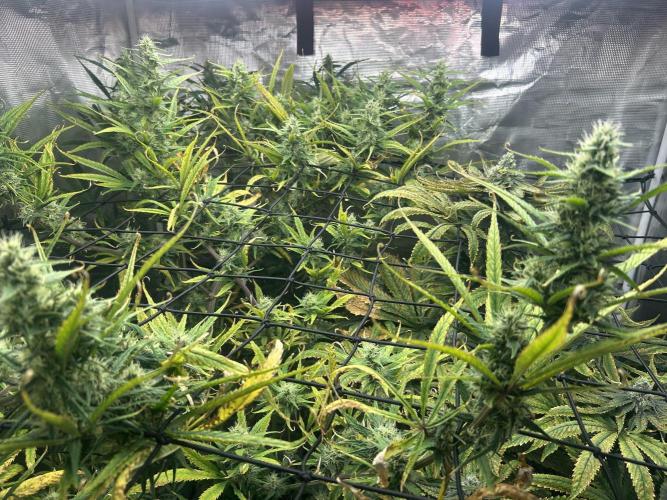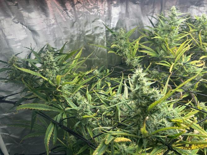 MontanaManMedical She’s STILL stretching! Even the lowest branches are peeking through the 2nd net. Nutrient levels seem to be within range despite the stretch. It looks like the N level is enough. Saturday will mark 4 weeks since the switch to 12/12, so I imagine the stretch is almost finished. I pinched the tops of some of the branches to help slow them down. You can see the Girl Scout Crack she shares the tent with. No way to hide it. That plant looks healthy as well.