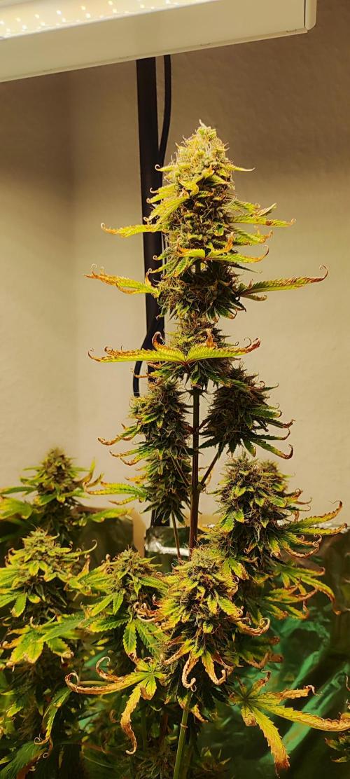 Absolutely a one-of-a-time kind of thing for us! She's constantly trying to hug the lamp by growing that high, it's hilarious. Buds are developing fine, while the leaves are constantly screaming of getting burned. No possibility of changing her conditions though, so she just has to live with that until it's time to harvest!