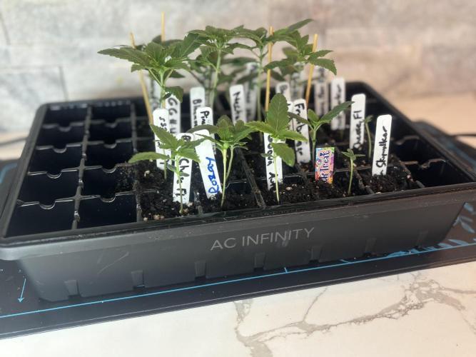 Crop_Top Got all the plants transplanted and labeled (GF decided to name them 🤣). Used FFOF soil, perlite, and worm casings (70/20/10 mixture) in 5gal fabric pots. 48 hours after transplanting I did notice a little purple color in the stems (hoping just from stress) so will be keeping an eye on that the next few weeks. Used CalMag (1mg per gallon) in my RO water and leveled Ph to 6.2 with 230ppm.