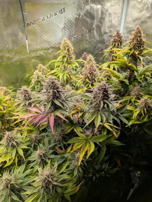 Flowers are clearly visible now, with one of the plants already showing a strong purple colour — very curious to see how this develops! 💜 However, the top-right plant is looking a bit limey, so I’ve ramped up the nutrients while keeping an eye on the runoff.