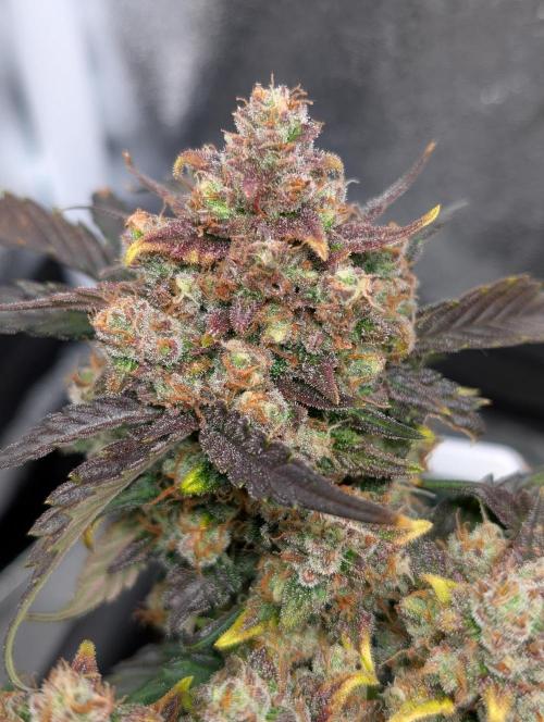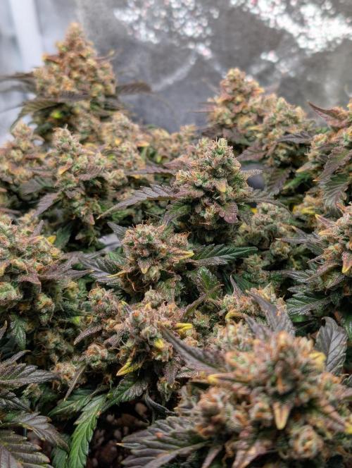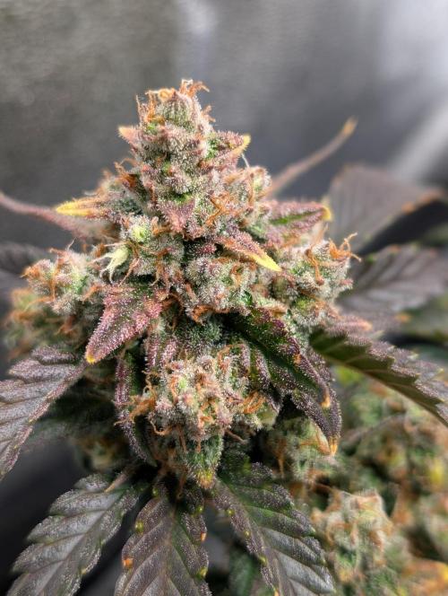 Green_Zyphoria The Tropicana Cookies plant is progressing nicely. The buds are dense and frosty, with the characteristic purple fading visible in the leaves. The plant is currently on a water-only feeding schedule to finish the cycle cleanly. ​Buds are still developing and swelling. Resin production is high, but they are not yet fully mature. I've checked the trichomes, and while they are very frosty, the majority are still clear or milky. No amber is visible yet. ​We are approaching the final window, but it's not harvest time yet. I'll continue monitoring the trichomes daily.