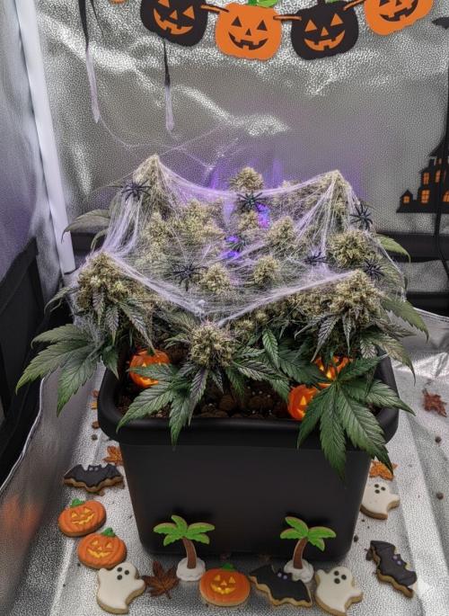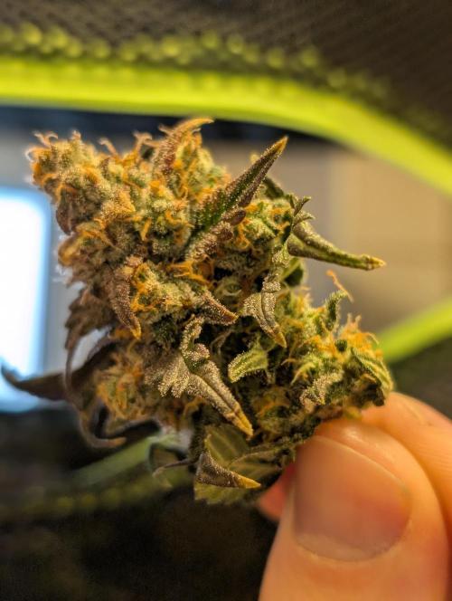Green_Zyphoria Nine weeks old and we are seriously close to the finish line! My Tropicana Cookies plant is looking absolutely beautiful and harvest is imminent. I've started seeing the first few trichomes turn amber, which is the signal I've been waiting for. I'll hold off for a few more days, just to let it ripen a little more before the final chop. ​She is now on a strict diet of plain water only. To help prevent any chance of bud rot this late in the game, I've cranked the fan up a notch to ensure excellent airflow around the dense buds. ​The smell is getting really incredible and super fruity now. It's taking a lot of willpower not to be too impatient and harvest early! Fingers crossed I can hold out for just a little longer.
