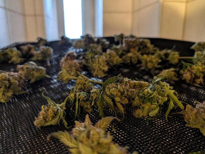 Green_Zyphoria We've reached the finish line! The ladies were chopped down after mathbf{9.5} weeks of flowering. ​So far, I'm really happy with how things turned out. The smell is absolutely incredible, and the buds are super compact and dense. Exactly what I was hoping for! ​I've done a bit of a wet trim, removing all the large fan leaves. The rest of the trimming (sugar leaves) will be done after they dry – a proper dry trim. ​To prevent any chance of mold developing, I've also taken the step of breaking apart the larger, denser buds slightly. This will ensure good air circulation and even drying inside the drying net. ​The harvest is now hung up/placed in the drying net, where they will slowly dry. The waiting game begins! More updates soon on the final weight and cure.
