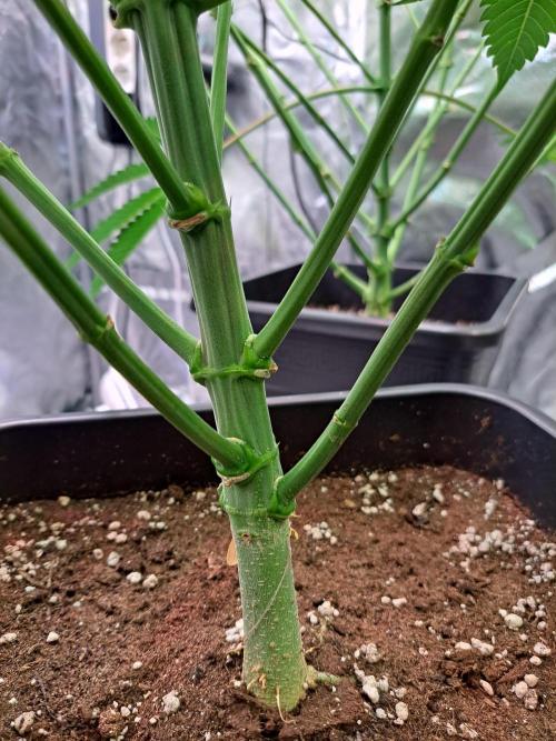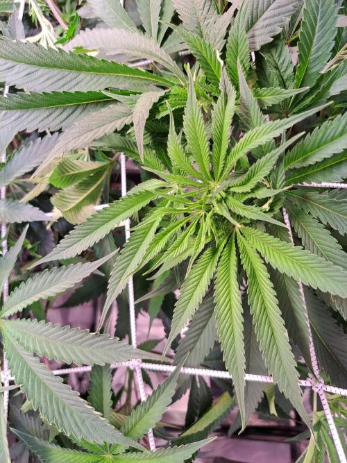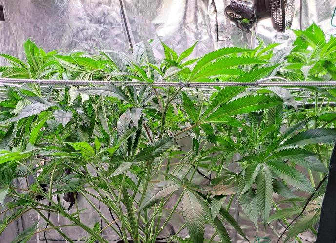 Hier und da werden große Blätter zwischen die Triebe gedrückt...morgen wird im Zelt etwas umgeräumt und sie erhält dann mehr Platz.