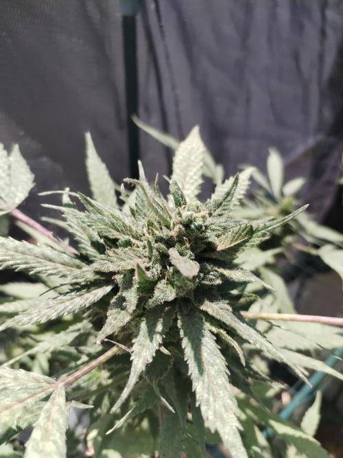 Riboh Deep into flower now, and the funky cheese aroma is taking over the tent—pungent, sweet, and sharp like a dairy aisle with attitude. Buds are stacking thick and heavy, with calyxes swelling and trichomes frosting everything like a powdered donut.