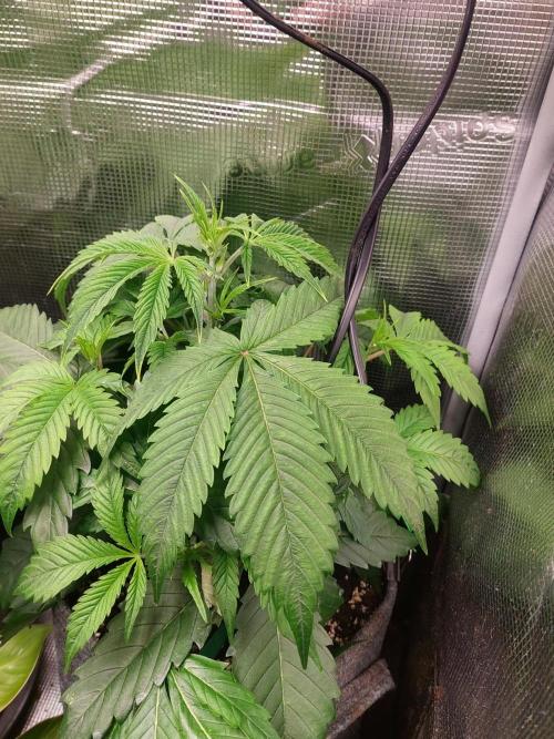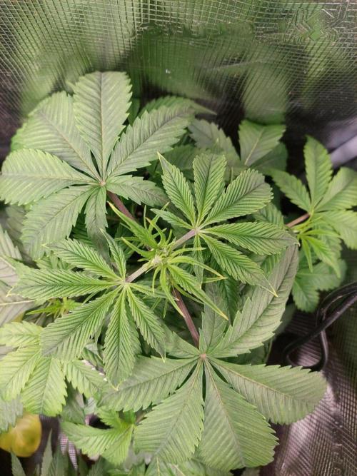 I've done some very very light defoliation of the biggest fan leaves and tied down the lowest side branches.