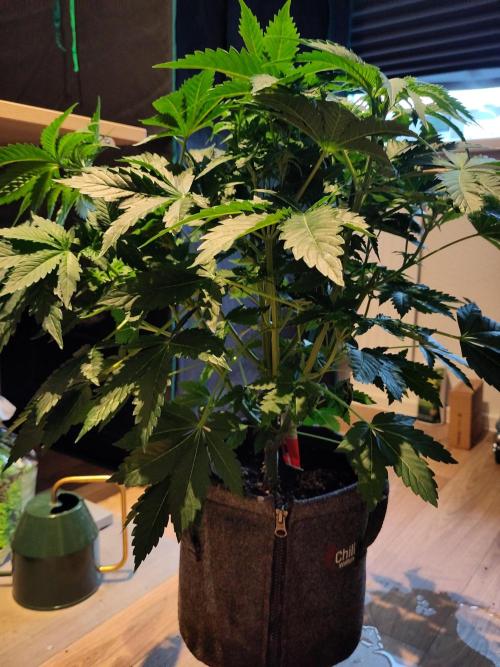 Die OG hatte diese Woche tatsächlich am wenigesten Probleme gemacht. Sie war leider im Zelt mit den unplanmässigen 24h Licht aber hat sich ansonsten bisher gut entwickelt. Das initiale spargeln hat sie wieder eingestellt. Ich freue mich ihr beim wachsen zuzusehen.