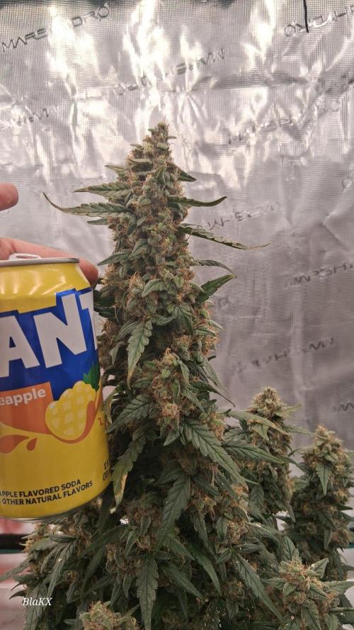 Aloah Growmies es sind die Momente am ende der Grow Reise wo ich die 63 Tage Reise review passieren lassen und das Ergebnis betrachte während mir eine Aggressive Prise Tropischer Ananas Kush in die Nase steigt und da in Farbverdünner,Chemisch Pinienwald Aroma übergeht! Die Harz Kristalle sind wie ein Teppich aus Diamonds der so dicht ist dass es die wunderschönen Lila Blüten Spitzen verdeckt. Erstaunlich was die Genetik trotz Zwitter Stress mit Pollensäcke und Thripse befall abgeliefert hat und zeigt dass selbst Automatic strains sich schnell regenerieren können ohne massiv Ertrag Einbußen;zu müssen samt Potenz.