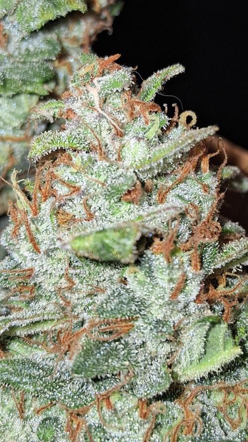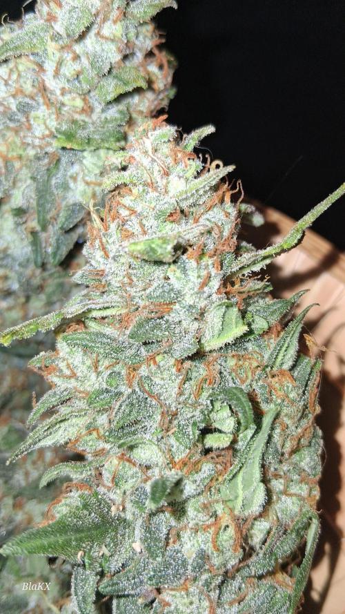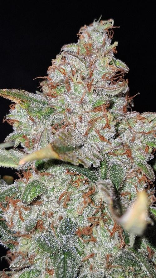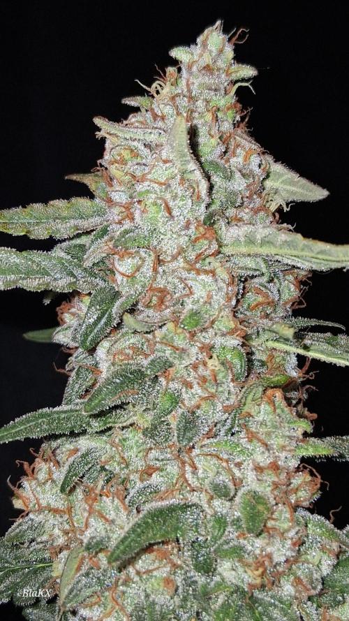 Dieser Strain ist eine echte Augenweide mit seinen fast Schwarzen Blättern und dunklen grünen Blüten die weiß vor Harz glitzern und leuchten Orangen Pistillen.