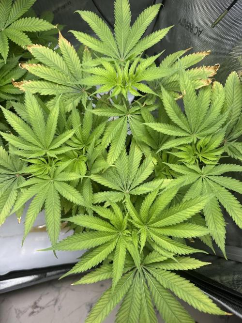 Great progress! I started with some low stress training and I keep defoliating the top branches to minimize their height advantage compared to the side branches. She is healty and vigorous, I'm so pleased by this plant. It's my best photoperiodic plant to date, when it comes to vigour and easyness. I try to form a canopy as even as possible, without using a trellis net. I want to be able to move my plants in and out of the tent so I don't want to use one. Let's see if the phenos are generous and let me train them evenly, even with the stretch in flower (that's not really in my power tho).