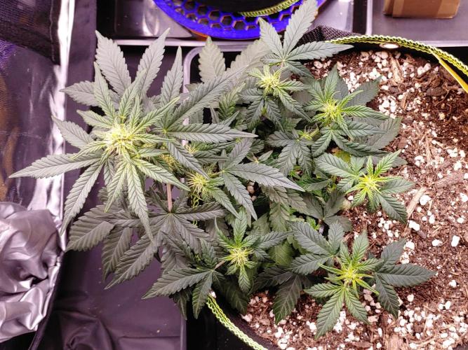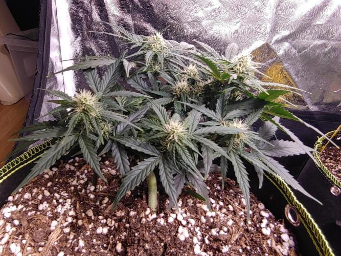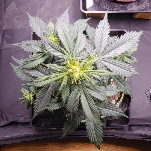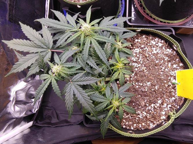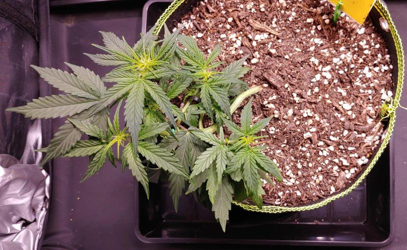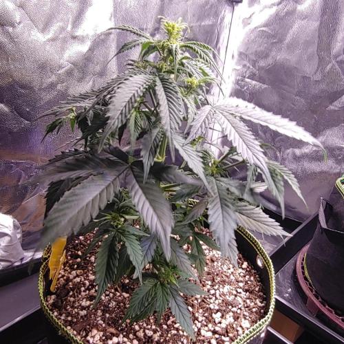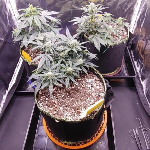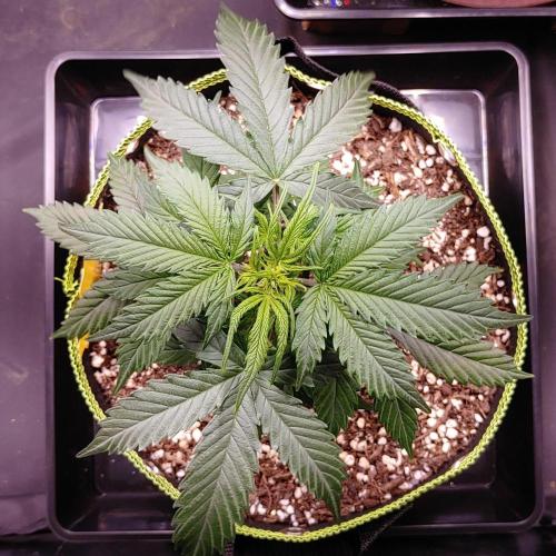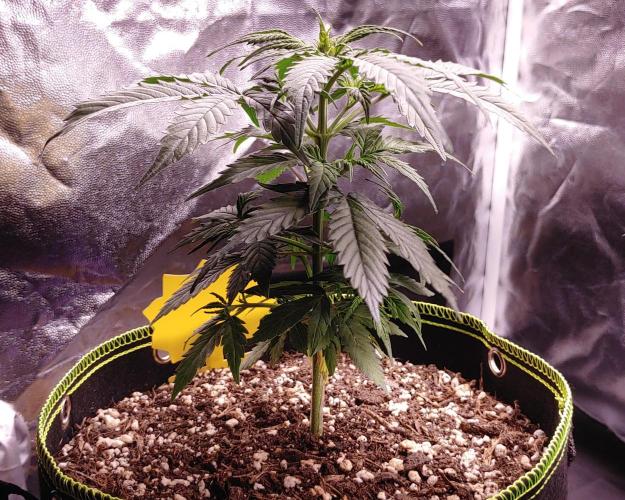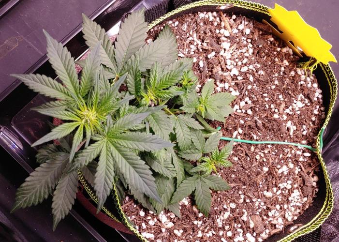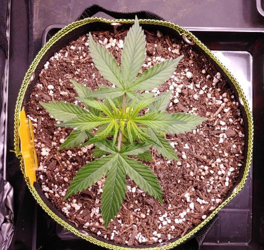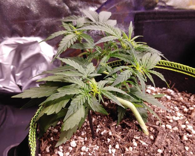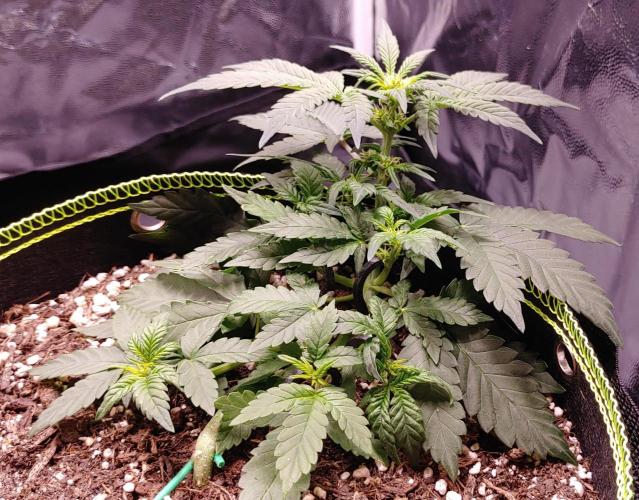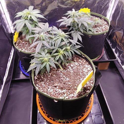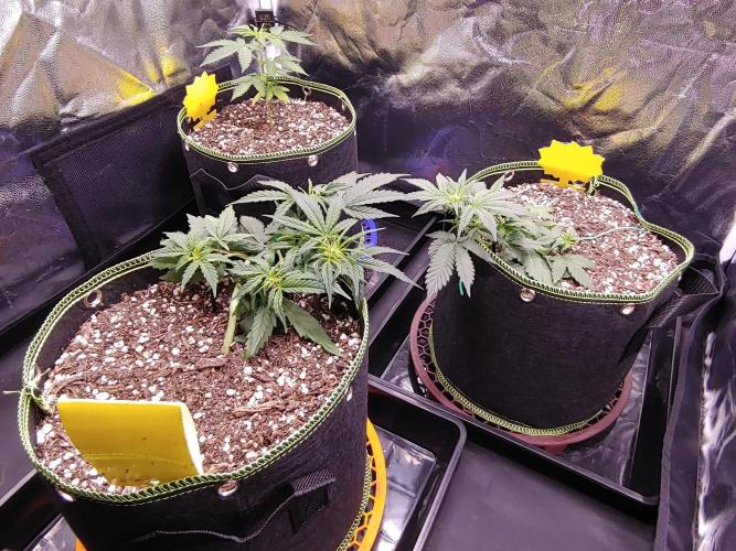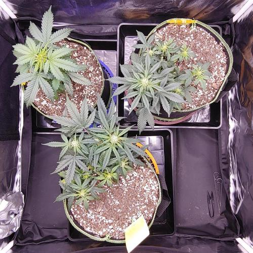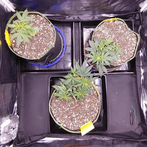 CountDoobie . 02/09/2025 The plants were watered too early and are showing slight signs of over watering. 03/09/2025 The two biggest plants are starting to show slight signs of light stress, slightly curled leaves and yellow leaf tips. Raised the growing light from approx. 50cm to approx. 60cm from the top of the plants. 04/09/2025 Hung a moist towel in the grow tent to increase RH%. 05/09/2025 All three plants received approx. 250ml of tap water around the edge of the pot, to promote root growth, and a little bit around the stem to keep the soil moist for the microbes. RH%: 70% Temp: 27C 07/09/2025 All three plants are growing well and the third node is developing rapidly, with the fourth node popping its head. One of the plants (Orange one) is a mutant. At first sight it appeared as if the third node was only developing one branch instead of the usual two branches per node. But is now developing three branches in the third node. It looks as if the plant was FIMed, even though nothing was done to the plant. Quite an interesting development and makes me intrigued in the result.