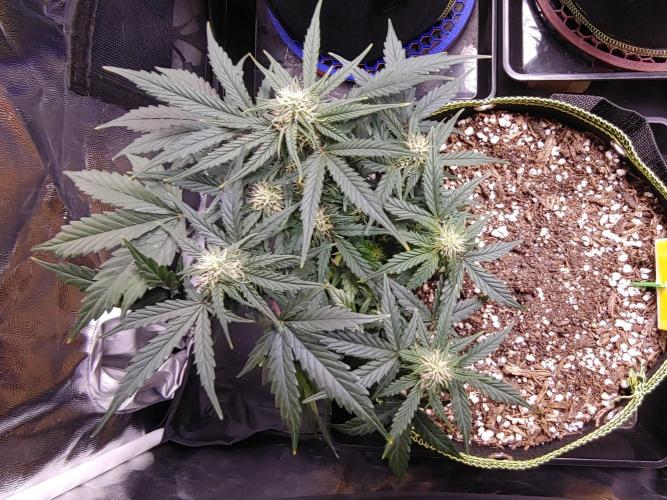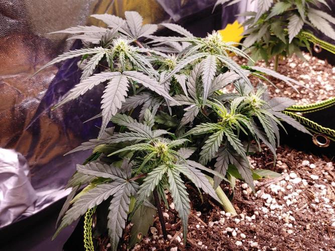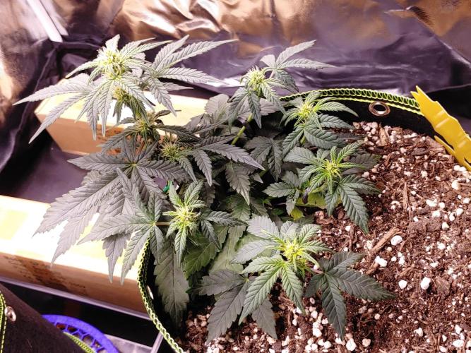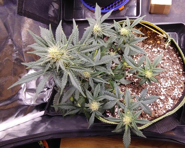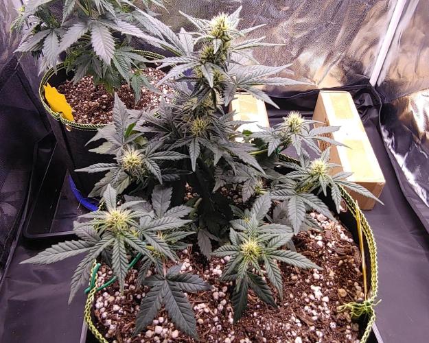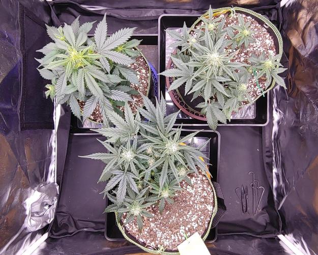 CountDoobie . 30/09/2025 All three plants received approx. 500ml banana peel tea (200ml/L), to add extra potassium and phosphor for the flowering stage. Recipe: Saved the peels from organic bananas in the freezer until 4 were collected. Dried the peels in a food dehydrator until they crumble. Ground the dried peels to small bits and put them in a teabag. Boiled 1L tap water and hung the teabag in the water. boiled it for 15min after which it was left to cool down. Put the tea in a container with the teabag still in and put it in the fridge. After 24h, the teabag was taken out and the liquid was strained with a coffee filter and put back in the fridge. 01/10/2025 Blue finally started to develop its first pistils, signing its transition into the flowering stage. 03/10/2025 Orange and purple received approx. 1L tap water. Blue received approx. 500ml tap water. 05/10/2025 Removed a few fan leaves from orange to increase light penetration. Removed the bottom branches from blue, because these weren't going to produce any worthwhile buds.