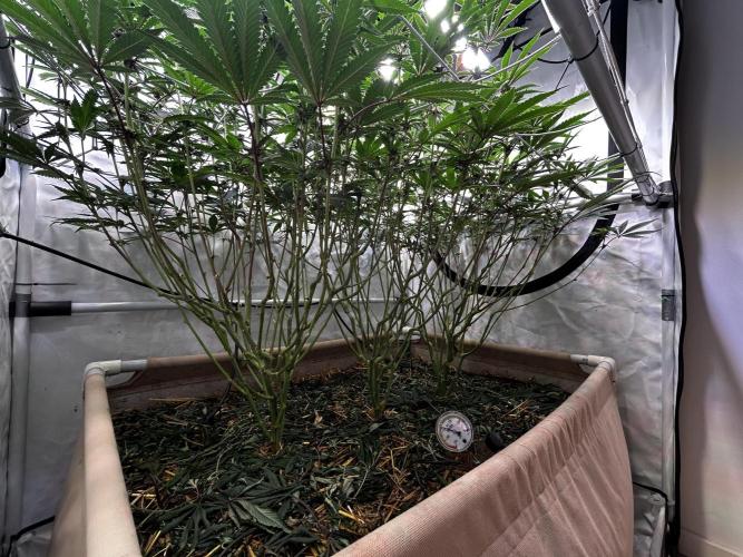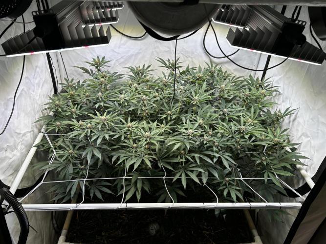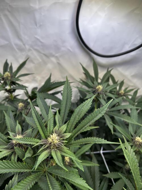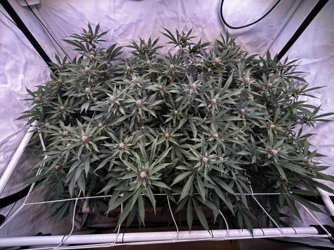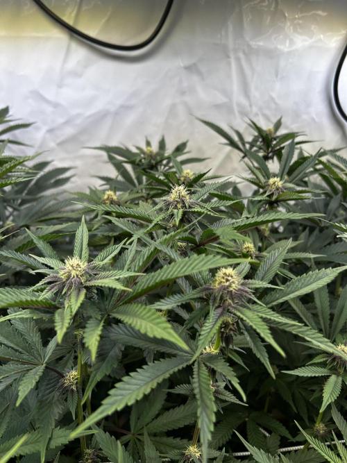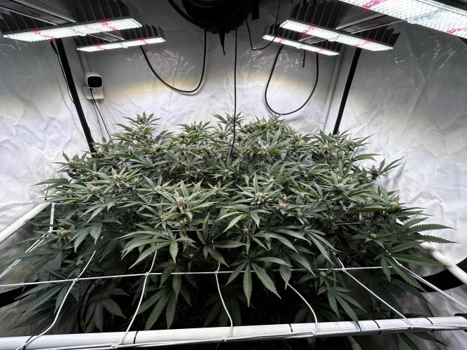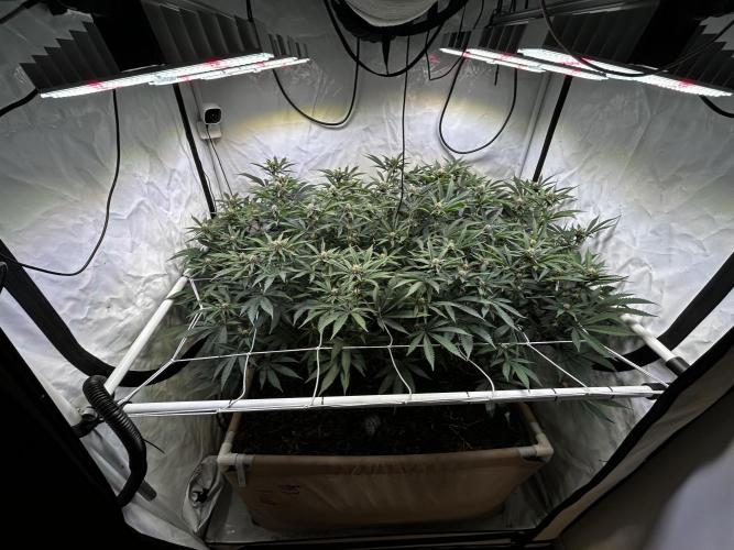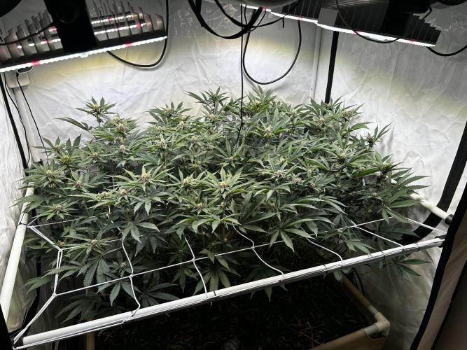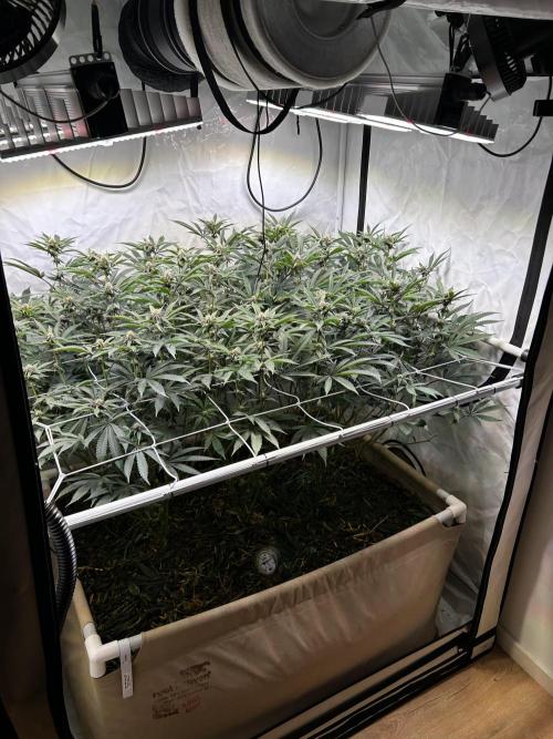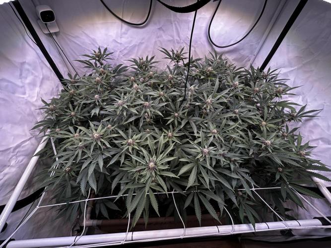 StoneyApple Day 5 of Flower Flipped to flower a bit earlier than planned due to rapid growth. The stretch is now kicking in, confirming that the early flip was the right call. Plants have gained over 20 cm in height within the past week. Installed a trellis net today. Lights are set to 70% intensity, and VPD is maintained at 1.2. I’ll be feeding a compost tea the next few days. Once the main stretch is over, I’ll begin lollipopping.