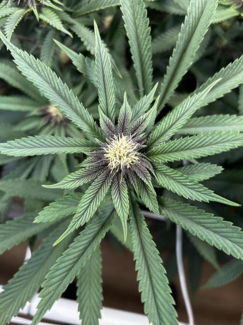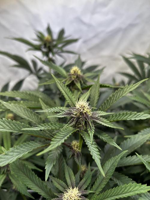 StoneyApple Day 19 Plants are looking super healthy and strong. Gave the lower half a light defol and trimmed a few small shoots. Buds are starting to show a nice dark purple tint and already have a soft fruity, floral smell. Gonna give them another compost tea soon. 🌿 Lights set to 90% VPD at 1.3