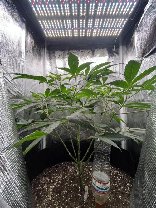 Cannabuss Transplanted into 3 gal pot. Currently making space in my other tent to put a 30 gal pot. Started light nutrients and added a self watering bottle.