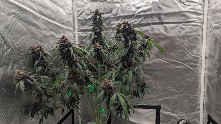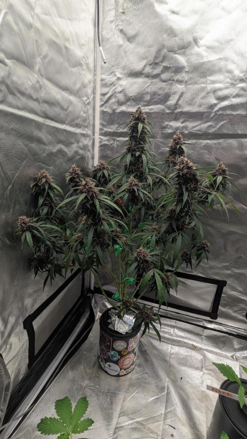 GroloCup Hammer down and rolling! She's giving me color and starting to show a little early frost. This one's gonna have legendary bag appeal and is starting to really put off a nice funky stank. I gave her a light defoliation and removed a few more lower branches that were never going to provide much for end product. Lights at 100% plus the supplemental UV-IR and I'm maxing out the nite strength to push her along even further. If she finishes flower like she started, you should all ask Brother Geoff to re-release this one so you can get in on this action.