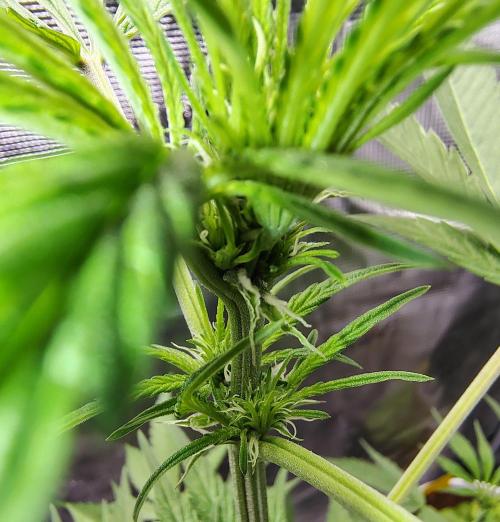 She's stretching really well, displaying a dominant stem and shorter surrounding shoots that I believe comes from the Gelato #33 genetics. I've not really done much trimming or defoliation, yet she looks almost naked. Her leaves indicate some stress, but the vigorous growth and appetite say "full steam ahead, Mister."