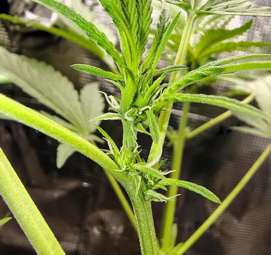 She is in 12/12 now, as she's stuck sharing the tent and lighting schedule with Ms. Stephen Hawking Kush (more like Bush). She's not quite showing yet, should be in a week or so, and if she's got any autoflower in her it may be impossible to tell because of the switch to 12/12 after 3 weeks. If she develops faster than the SHK than that might be a clue, but odds are she's a photo. either way I'll go really easy on the nutes for a while in the small chance she's an auto (as Auto's only need half as many nutrients as photos for whatever reason).