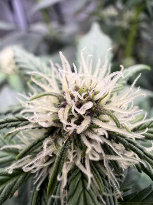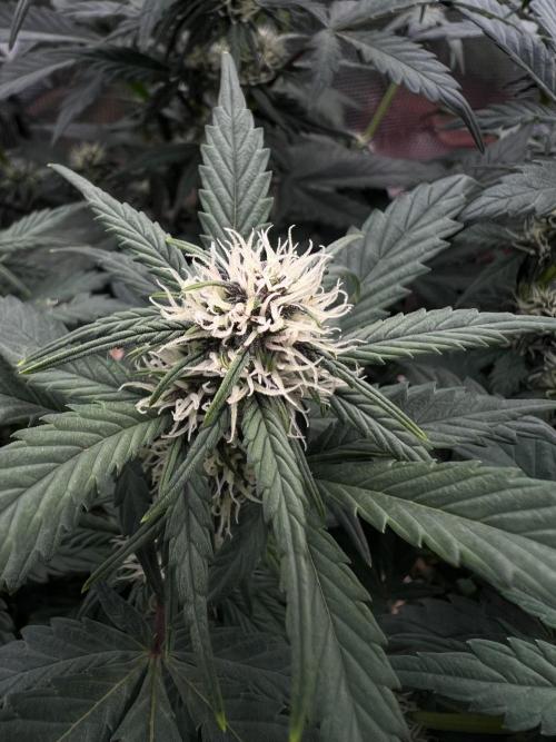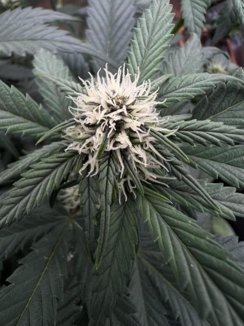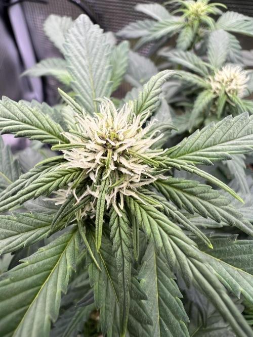 Die Vorblüte ist gestartet. Die ersten weissen Härchen sind zu sehen. Die Pflanze hat ein kräftiges Wachstum und wehrt sich beim LST ganz gerne. Das Toppen hat sie sehr gut verkraftet und hat den Seitentrieben einen schönen Schub gegeben.