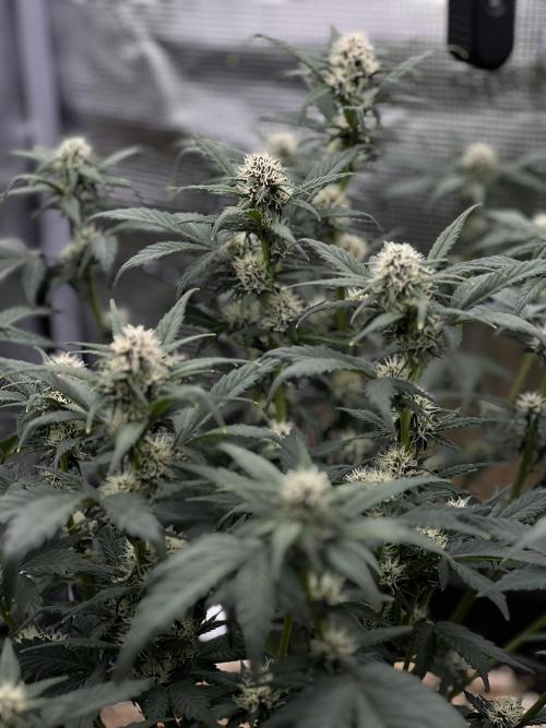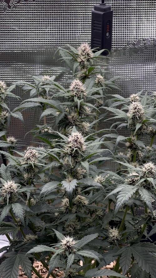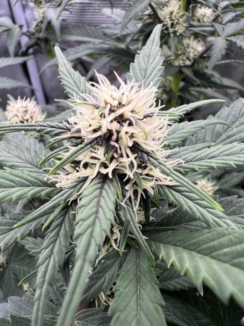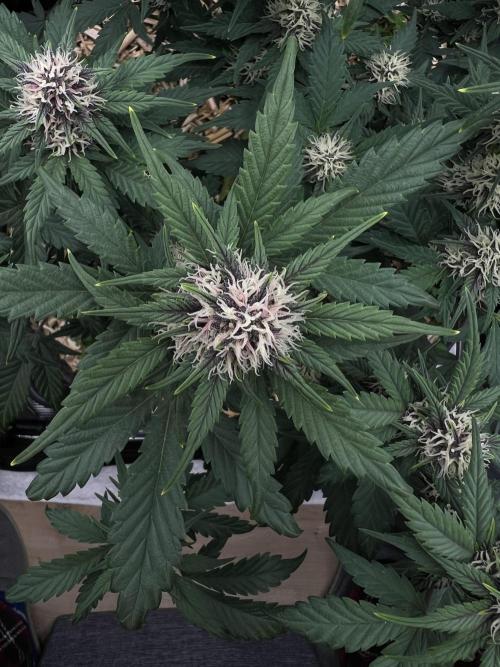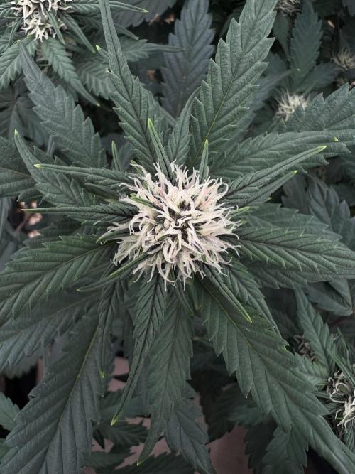 Die Vorblüte ist gestartet. Die ersten weissen Härchen sind zu sehen. Die Pflanze hat ein kräftiges Wachstum und wehrt sich beim LST ganz gerne. Das Toppen hat sie sehr gut verkraftet und hat den Seitentrieben einen schönen Schub gegeben.