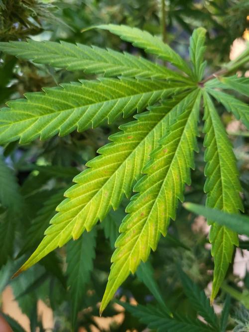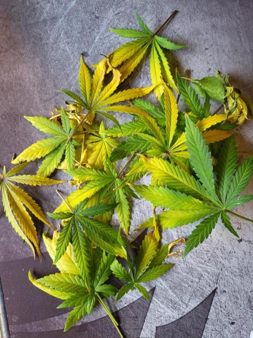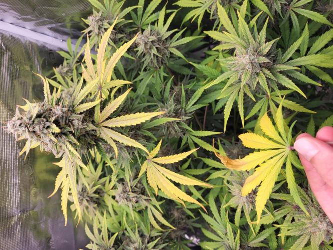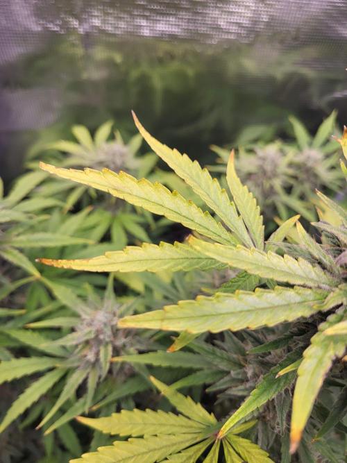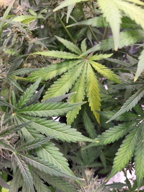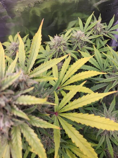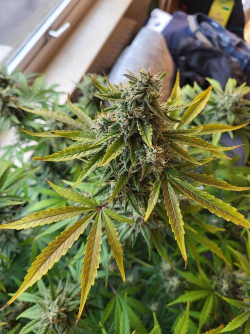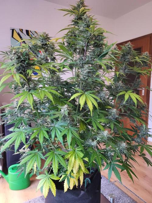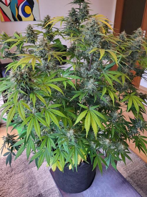 Michel445 It's the beginning of week 10, and I believe the harvest is (very) close. I asked the community if the plant is ready to be harvested, but some say it's going to take one more week and others say it's going to take at least three more weeks. I don't know what to make of it. When I look at the yellow leaves, it looks like some kind of nutrient problem but at the same time the plant looks very similar to the promoting pictures of Cosmos F1 on the RQS website: https://www.royalqueenseeds.de/f1-hybrid-cannabissamen/619-cosmos-f1.html A little yellowish/brownish on the edge of the leaves. I think it's advanced senescence already. Please tell me what to do, haha. I want to thank the community a lot for their support! Cosmos F1 smells so damn good =)))