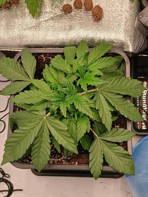 BettyFlores 02.10.2025 The small one has been fimmed yesterday. The bigger one got cut the upper fan-leaves for providing more light to the lower branches. This time I did it twice and after recovery I will just fim her or him. I could imagine, that keeping the main leaves cut constantly can provoke some kind of deficiencies. Let's try out and see what happens this time, by managing different training-methods through different stages of growing.