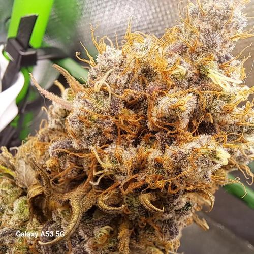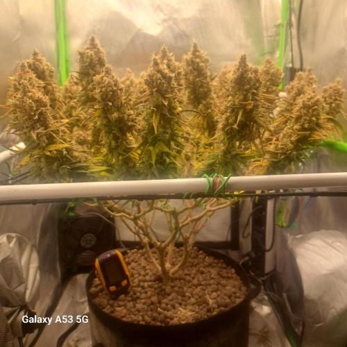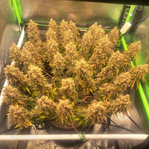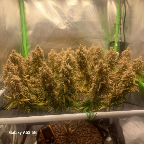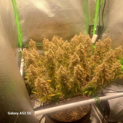 Daedra nun haben wir den aktuellen stand erreicht. ich berichte weiter nächste Woche. Verträgt volle 100% Düngung gebe 1200ppfd ungefähr, 50 bis 55 dli auf die gesamte Fläche die Lampe läuft auf 100% und ist 25 cm entfernt die pflanzen zeigen keinerlei Stress Symptome. dies ist mein erster grow wo rootmax von beginn an dabei ist und ich hatte noch kein einziges problem dieser run läuft bisher absolut perfekt. gut in der vegi hätte ich etwas regelmässiger trainieren können so würden 100% der buds sitzen jetz sinds halt 90%, sind nur 2 triebe die mir nicht ganz so gefallen aber immer noch top a buds. ich frage mich was abgehen würde wen ich co2 noch hätte und ne klima.