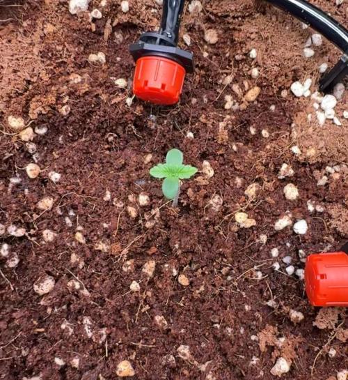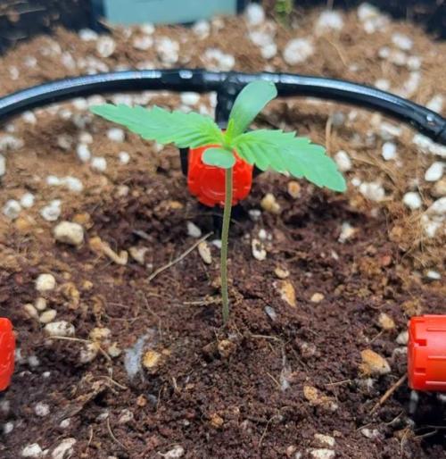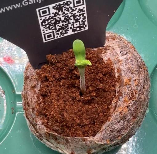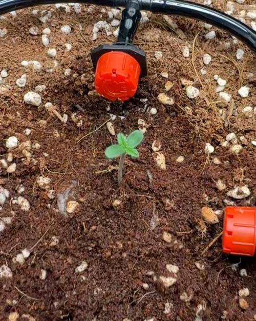 Nach der Keimung wurden die Sämlinge aus den Jiffys in Coco-Substrat umgesetzt. Das Medium wurde vorher angefeuchtet und mit leichter Nährlösung (EC 0.5 / pH 5.8) vorbereitet. Die Tropfbewässerung ist bereits installiert und läuft manuell ein bis zwei Mal täglich, um gleichmäßige Feuchtigkeit zu gewährleisten.