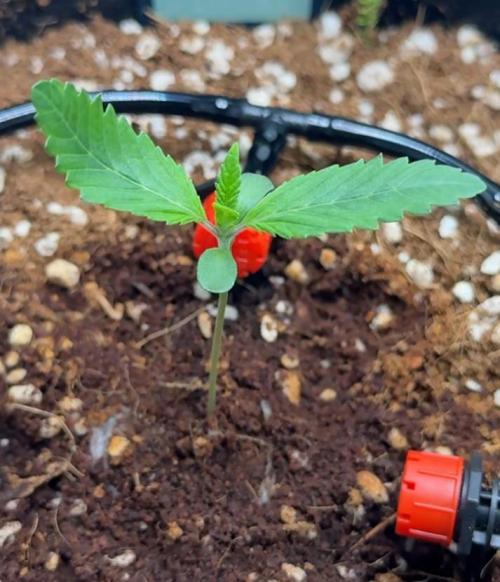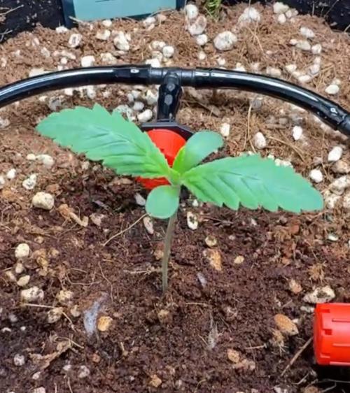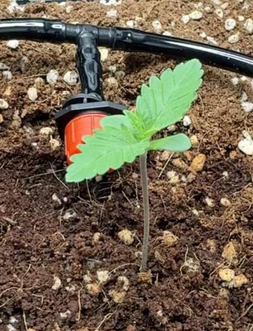 HOME_GROWBOOK Die Sämlinge von 24K Gold und Gelato 33 entwickeln sich gleichmäßig und vital. Beide Sorten haben die Keimphase problemlos überstanden und zeigen jetzt das erste echte Blattpaar. Die Tropfbewässerung läuft zuverlässig, und das Substrat bleibt konstant feucht, ohne Staunässe.