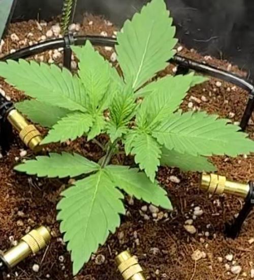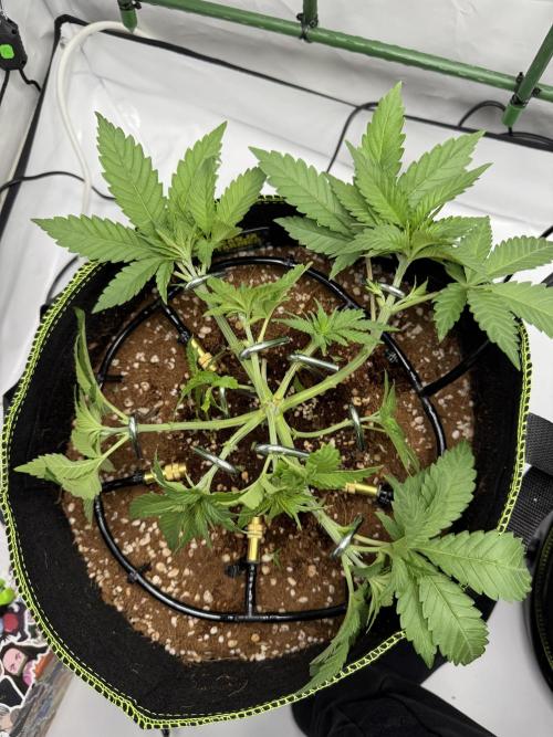 Bei 24K Gold wurde ein gezieltes Topping durchgeführt, um die Seitentriebe zu fördern und ein flaches, gleichmäßiges Blätterdach zu formen. Die Pflanze reagierte stressfrei und zeigt bereits neue, kräftige Triebspitzen. Die internodale Abstände bleiben kompakt, die Blätter sind groß und tiefgrün – ein Hinweis auf starke Photosyntheseleistung.