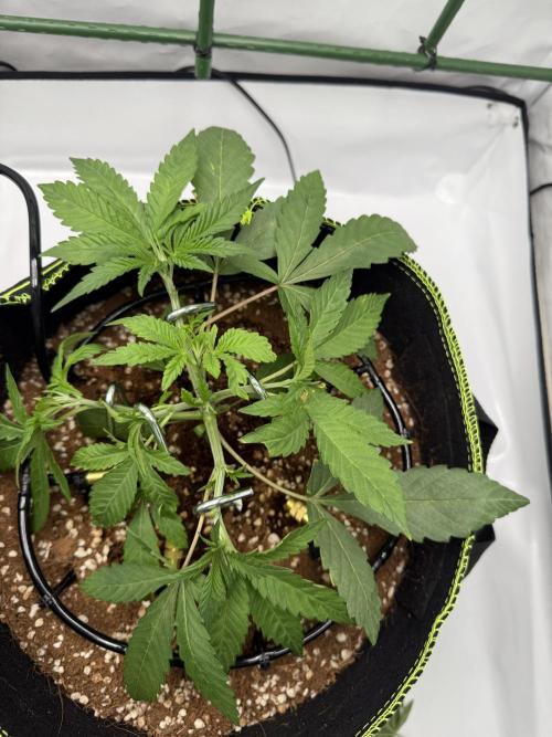 Gelato 33 wurde leicht gebunden (LST), um die Haupttriebe nach außen zu lenken und mehr Licht in die Mitte zu bringen. Das Resultat ist ein schön offenes Wachstum mit vielen gleichwertigen Triebspitzen. Ihr Aufbau bleibt kompakt, die Blätter sind breit und fleischig – typisch für die Indica-Dominanz dieser Genetik.