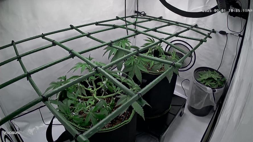 Das ScroG-Netz wird täglich leicht nachjustiert, um alle Triebe auf einer Höhe zu halten und die Fläche vollständig auszunutzen. Der Blätterteppich ist jetzt schön ebenmäßig – perfekte Basis für die kommende Bud-Entwicklung.