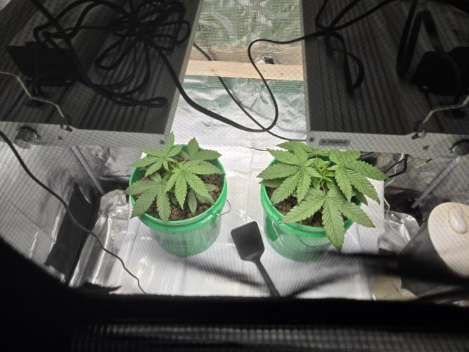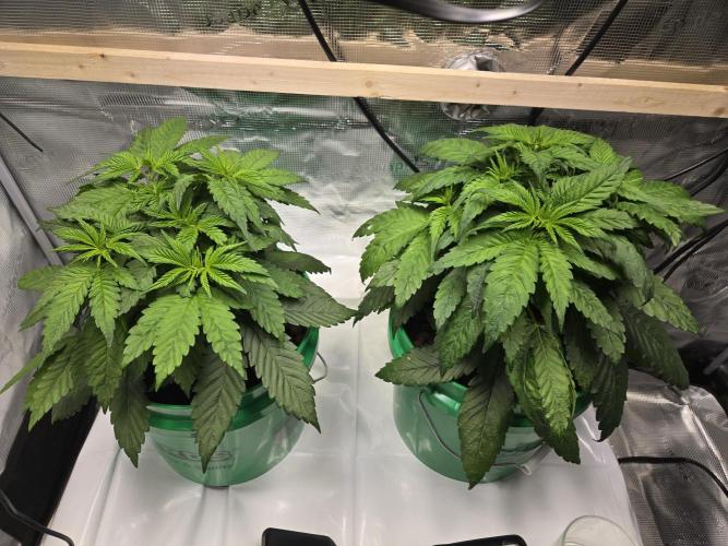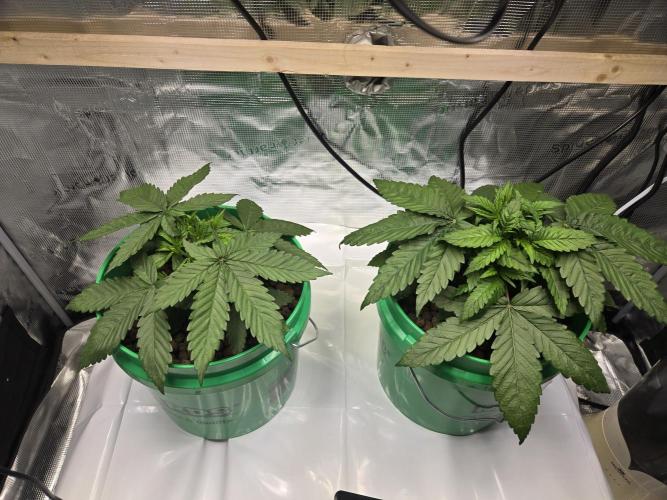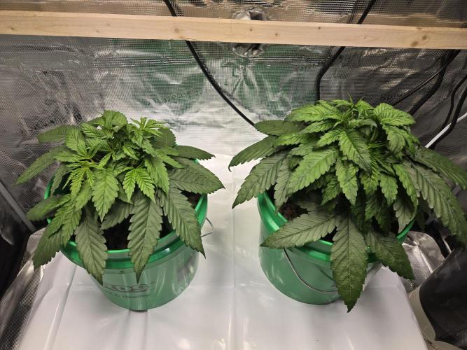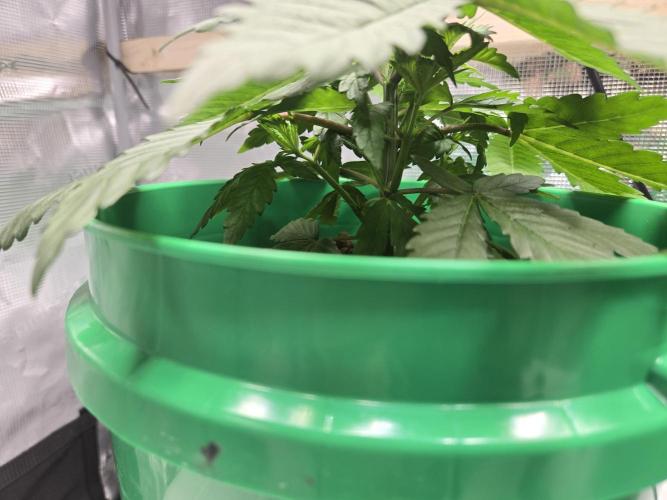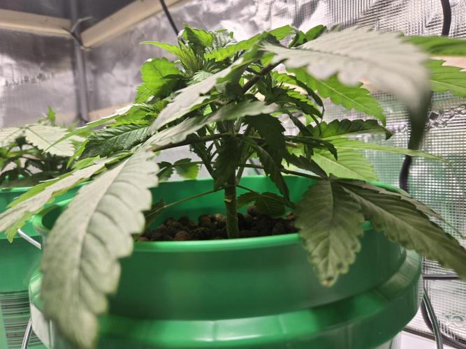 The tops are all coming up nicely. Both have 6 tops at the canopy level, with the 2 bottom nodes not far behind. Noticing clawing later in the week. This happened during my last grow around this time. The buckets don't drain the last 1/4 inch of water. I dropped back the feeding to a minute every hour, the same as last time. This helped again, they look more perky. They are somewhat darker green but not too much. Possibly a nitrogen excess. I used to flood for 15 minutes every hour with higher EC solutions. Which is why I will go back to a flood table the next grow. I can ensure proper dry backs and rule out watering amounts vs frequency more easily.