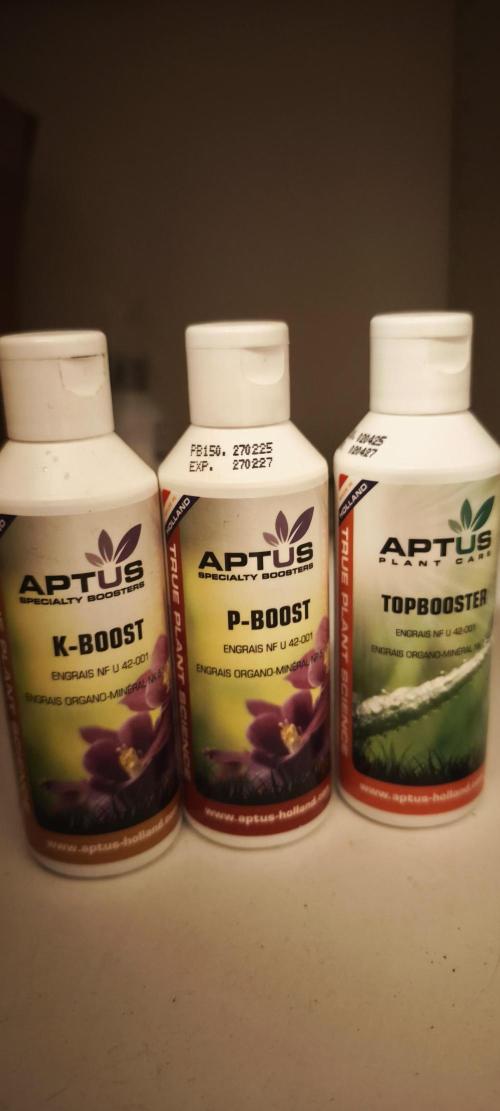 Diminuer l’apport en azote pour favoriser la floraison. Baissé le all in on et ajouter du p boost et changer di start booster au top booster aptus , out of stock regulator 😲😭