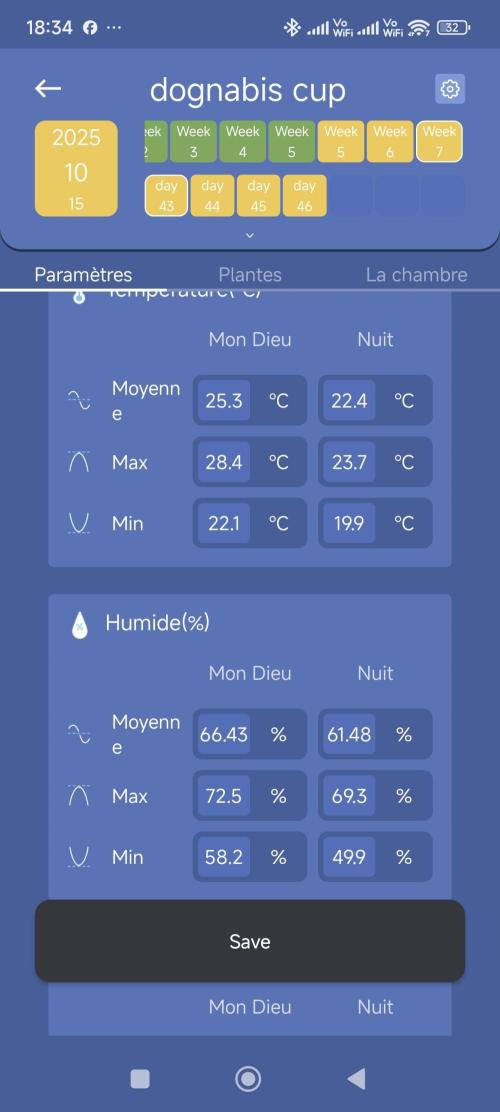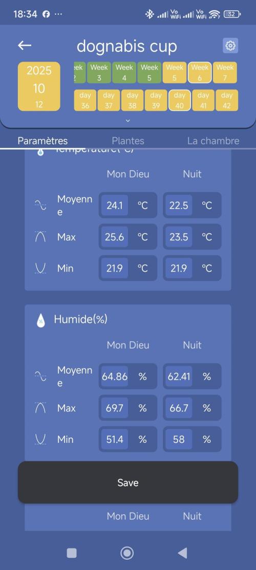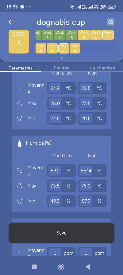 Notes :Les paramètres ont été optimisés cette semaine avec une augmentation de la lumière (PPFD) et un réglage précis du VPD.