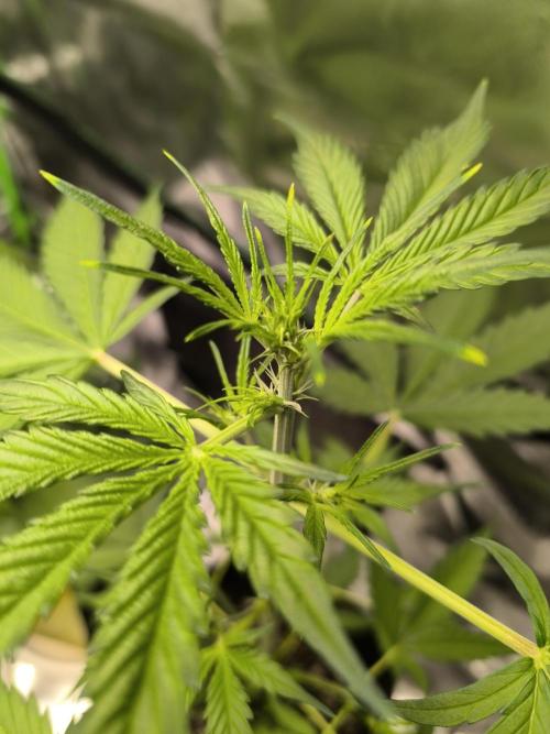 09/27: Started the day noticing chlorosis on some leaves. The pattern matches an iron deficiency: interveinal chlorosis mainly on the newer leaves. After checking, this seems to be caused by a nutrient lockout, consistent with the high substrate pH since the beginning of the grow. Lesson learned for next time. Performed a heavy flush with 20 L of water per plant. Runoff dropped from EC 1200 → 500 and pH 7.1 → 6.7. From now on, I’ll water with enough solution to get ~20% runoff each time instead of just ~250 ml. Will also lower input pH to 5.6–5.7 to gradually bring substrate pH down into range. Noticed that some plants have started to give off a light smell 🌿.