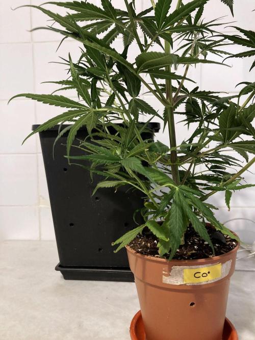 Ayer le hice el corte apical a la semilla recogida del suelo, la morfología de ambas plantas es diferente, Congo se estira, mientras la semilla desconocida crece mucho más compacta y ramificada, estoy deseando que sea una hembra.