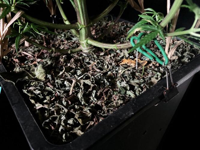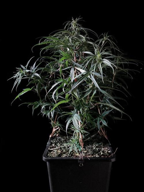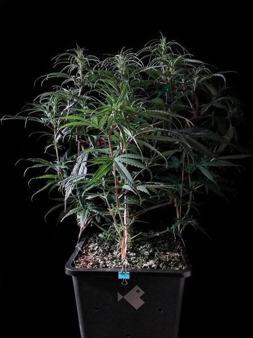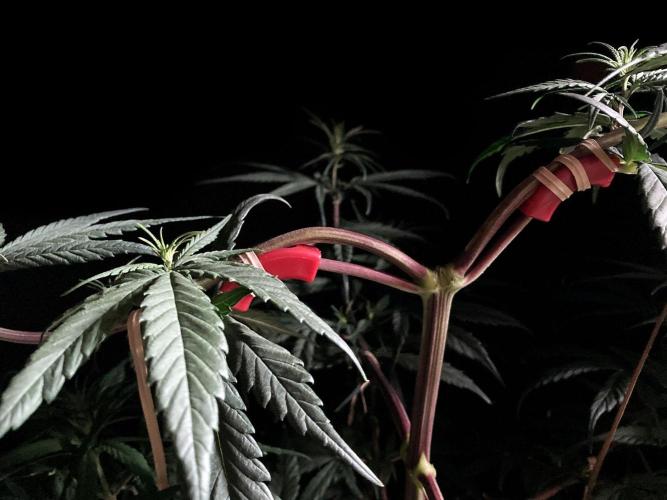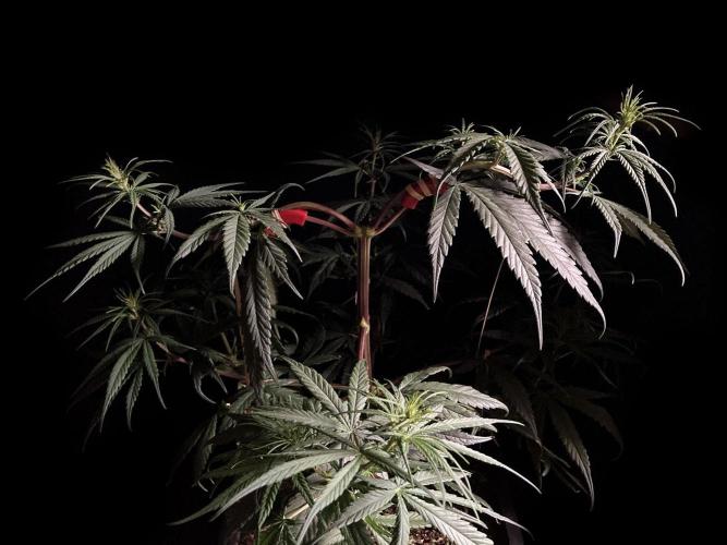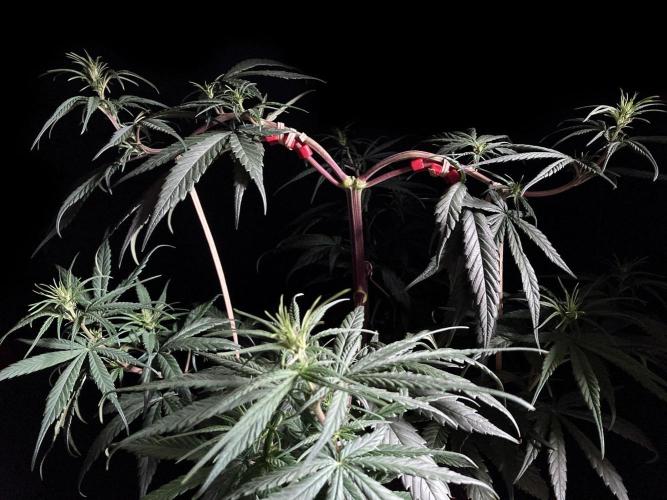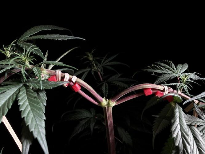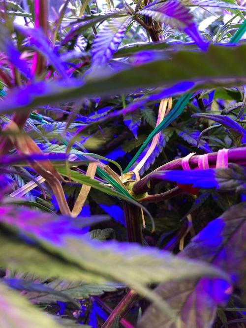 Para frenar el crecimiento en altura tengo múltiples ataduras a las ramas, sobre todo a las dos superiores, donde he hecho una curva estrambótica a base de dobleces y ataduras, definitivamente domar una sativa landrace es cosa seria! 😁