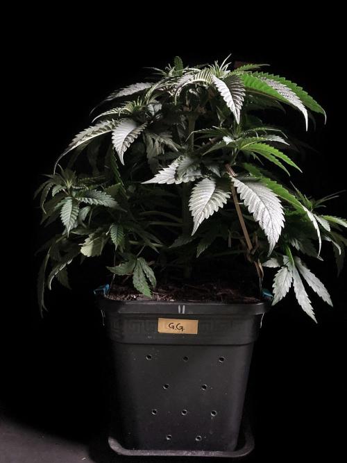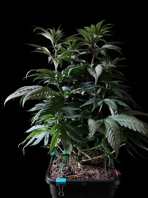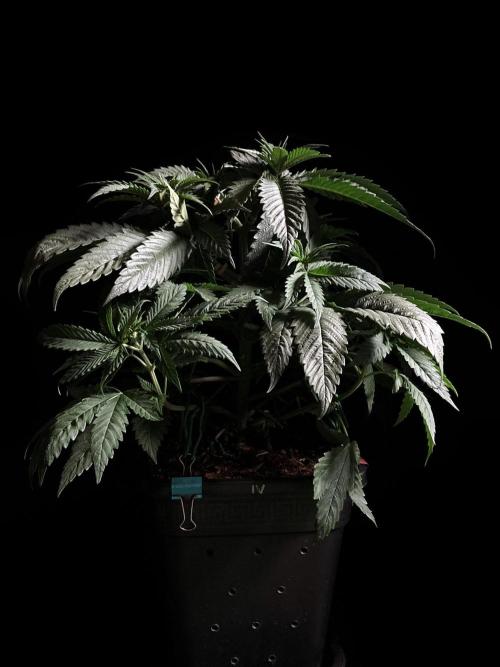 De momento la alumbro durante 21 horas y la riego exclusivamente con agua de manantial, melaza y Microorganismos de Montaña Activados de forma líquida y un poco de Humato de leonardita (ácidos húmicos), de esta manera inoculo masivamente microbiología y favorezco el ecosistema microbiano, para que solubilice los nutrientes y minerales del sustrato, al tiempo y de momento, no fuerzo a la planta a alimentarse con Bio Nutrientes solubles, y de esta manera también facilito la expansión de las raíces por la maceta. Cultivar sin molestar, ese es el objetivo, para que las plantas demuestren desde jóvenes hasta donde pueden llegar.