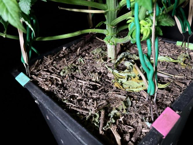 De momento la alumbro durante 21 horas y la riego exclusivamente con agua de manantial, melaza y Microorganismos de Montaña Activados de forma líquida y un poco de Humato de leonardita (ácidos húmicos), de esta manera inoculo masivamente microbiología y favorezco el ecosistema microbiano, para que solubilice los nutrientes y minerales del sustrato, al tiempo y de momento, no fuerzo a la planta a alimentarse con Bio Nutrientes solubles, y de esta manera también facilito la expansión de las raíces por la maceta. Cultivar sin molestar, ese es el objetivo, para que las plantas demuestren desde jóvenes hasta donde pueden llegar.