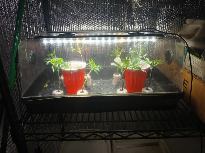 Details: Watered the OG Kush and Blue Zkittlez clones with 2,000 mL of Jack’s 3-2-1, pH adjusted to 6.0. Also gave the Nerds Rope and Tropical Rozay seedlings 20 mL of Jack’s 3-2-1, pH adjusted to 6.0. Defoliated the OG Kush and Blue Zkittlez clones.