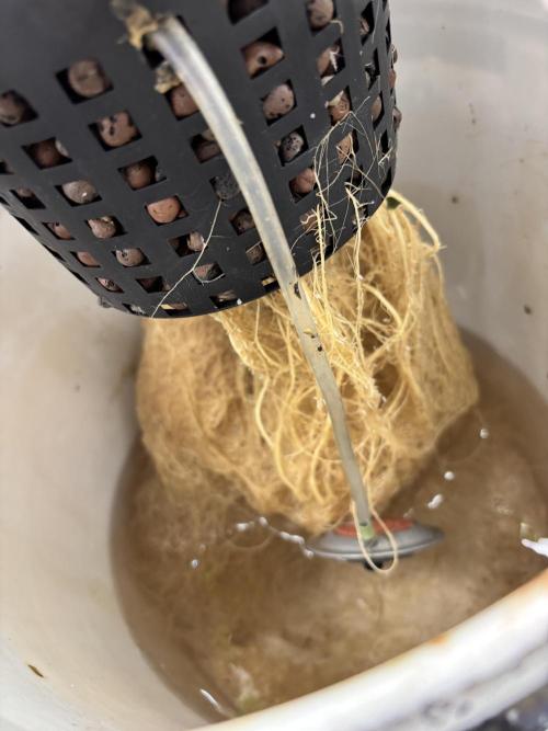 DWC water system, roots are looking healthy but a slight yellowish/brownish tint (dont know if this is from nutrient intake).