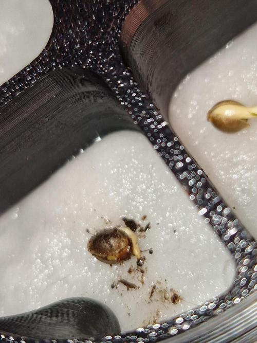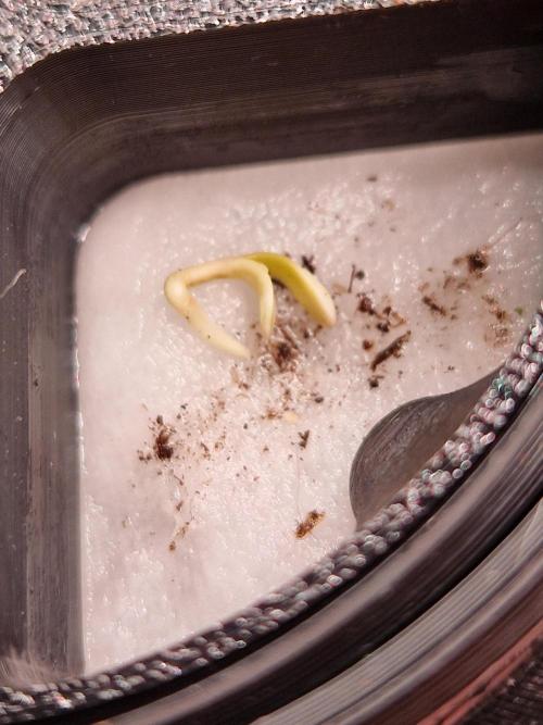 nach 1 Tag kam unten schon ein weißer Wurzelanfang raus und dachte mir, mach in die Erde.. hab dann aber doch bisschen Angst gehabt, dass ich zu tief beziehungsweise zu viel Wasser angegossen hatte. Deswegen hab ich den Samen vorsichtig geborgen und zurück in die Keimstation getan.